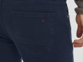Однотонные джинсы зауженного кроя из хлопкового денима с добавлением эластана, с плотностью 13 oz (средней) на ростовку 33. Пятикарманная модель с декоративными подрезами на задних карман и вышивкой логотипа в виде буквы M. Джинсы со строчкой в цвет ткани по контуру и кокеткой сзади. На талии есть шлёвки для ремня, патч из искусственной кожи на поясе и металлические заклёпки с фирменными логотипами "Mossmore". Застёжка на молнию и болт-пуговицу. Рост модели 183 см, размер 32.