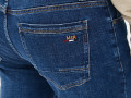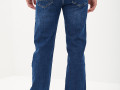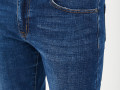 Джинсы широкого кроя брючин из синего плотного денима (13.2 oz) с потертостями, а также ручной обработкой потертостей краев карманов и низа брючин. Модель на рост 176-182 см с пятью карманами с контрастными строчками и фирменной вышивкой логотипа на кармане сзади. На талии есть шлёвки для ремня и патч из рыжей экокожи. Застёжка на молнию и болт-пуговицу. Размер на модели 33, рост 189 см.