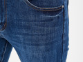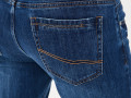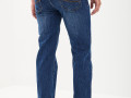 Джинсы прямого кроя широкого размерного ряда из синего плотного денима (13.2 oz) с потертостями и фигурными контрастными строчками на карманах сзади. Модель на рост 182-188 см с декоративным монетным карманом спереди и металлическими заклепками. На талии есть шлёвки для ремня и патч из экокожи. Застёжка на молнию и болт-пуговицу. Размер на модели 33, рост 189 см.
