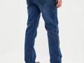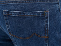 Синие джинсы прямого кроя из плотного денима (13,2 oz) с ручной обработкой потертостей краев на карманах сзади. Модель на рост 176-182 см с фигурными контрастными строчками на карманах. На талии есть шлёвки для ремня, патч из экокожи на поясе и металлические заклёпки спереди. Застёжка на молнию и болт-пуговицу. Размер на модели 33, рост 189 см.