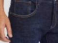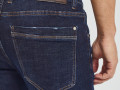 Джинсы зауженного кроя из хлопкового денима с добавлением эластана, с плотностью 12,8 oz (средней), на ростовку 33. Пятикарманная модель с декоративным рельефом у монетного кармана и подрезами на задних карманах с потёртостями краёв. Джинсы с контрастной строчкой по контуру и кокеткой сзади. На талии есть шлёвки для ремня, патч из искусственной кожи на поясе и металлические заклёпки с фирменными логотипами "Mossmore". Застёжка на молнию и болт-пуговицу. Рост модели 187 см, размер 32.