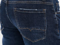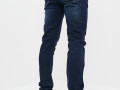 Джинсы зауженного кроя из плотного темно-синего денима (13.2 oz) с добавлением эластана с небольшими потертостями и контрастными строчками. Модель с ручной обработкой потертостей краев карманов, а также низа брючин. Джинсы на рост 178-184 с декорированными карманами сзади. На талии есть шлёвки для ремня и патч из искусственной кожи. Застёжка на молнию и болт-пуговицу. Размер на модели 32, рост 187 см.