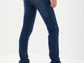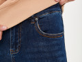 Прямые джинсы из плотного синего эластичного денима (13 oz) с высокой посадкой и декоративными контрастными строчками на карманах сзади. Пятикарманная модель на рост 172-1782 см. На талии есть шлёвки для ремня, а также фирменный патч из контрастной экокожи "Mossmore". Застёжка на молнию и болт-пуговицу. Размер на модели 27, рост 175 см.