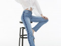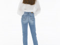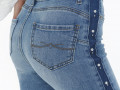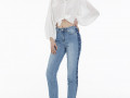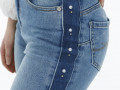 Женские джинсы из голубого денима с декоративными лампасами из жемчужных бусин. Эта модель прямых брюк со средней посадкой. На задних карманах декоративная отстрочка. Застежка на молнии, брендовая фурнитура, пуговица на поясе и шлевки для ремня. Ткань содержит небольшое количество эластана, благодаря этому форма остается неизменной на протяжении всего срока носки.